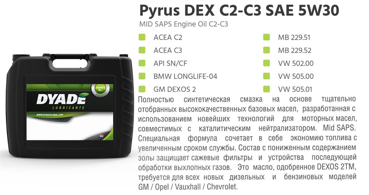 Масло моторное DYADE Lubricants Pyrus DEX C2-C3 5W-30, 20 л (574297) Dyade Lubricants 574297